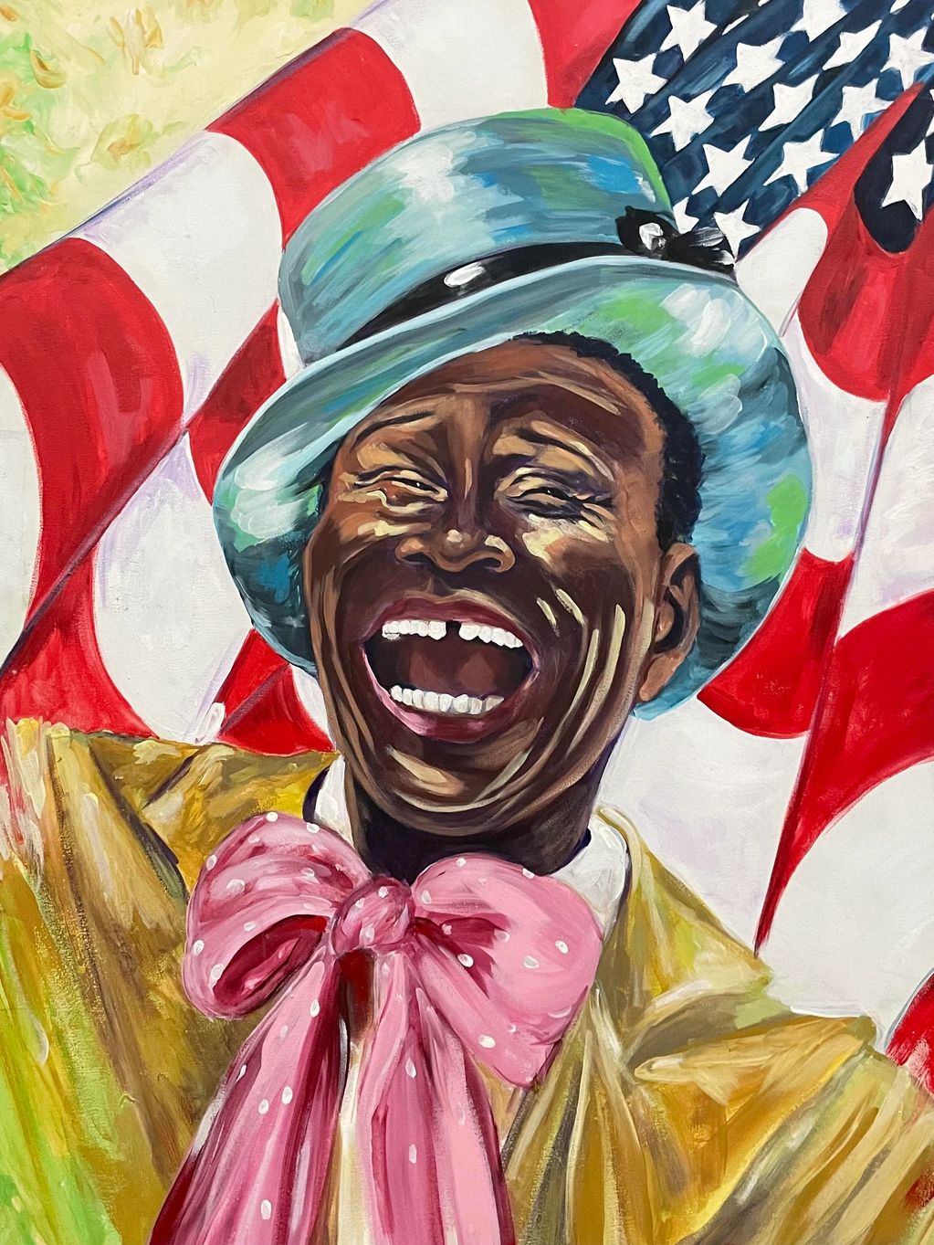 “I am proud to be an American” offers a layered exploration of identity, pride, and societal expectation.  This piece challenges viewers to reflect on the ongoing struggle for authentic representation and the persistence of stereotypical roles imposed on Black individuals. It is both a celebration and a critique—an expression of resilience amid a complex North American narrative.